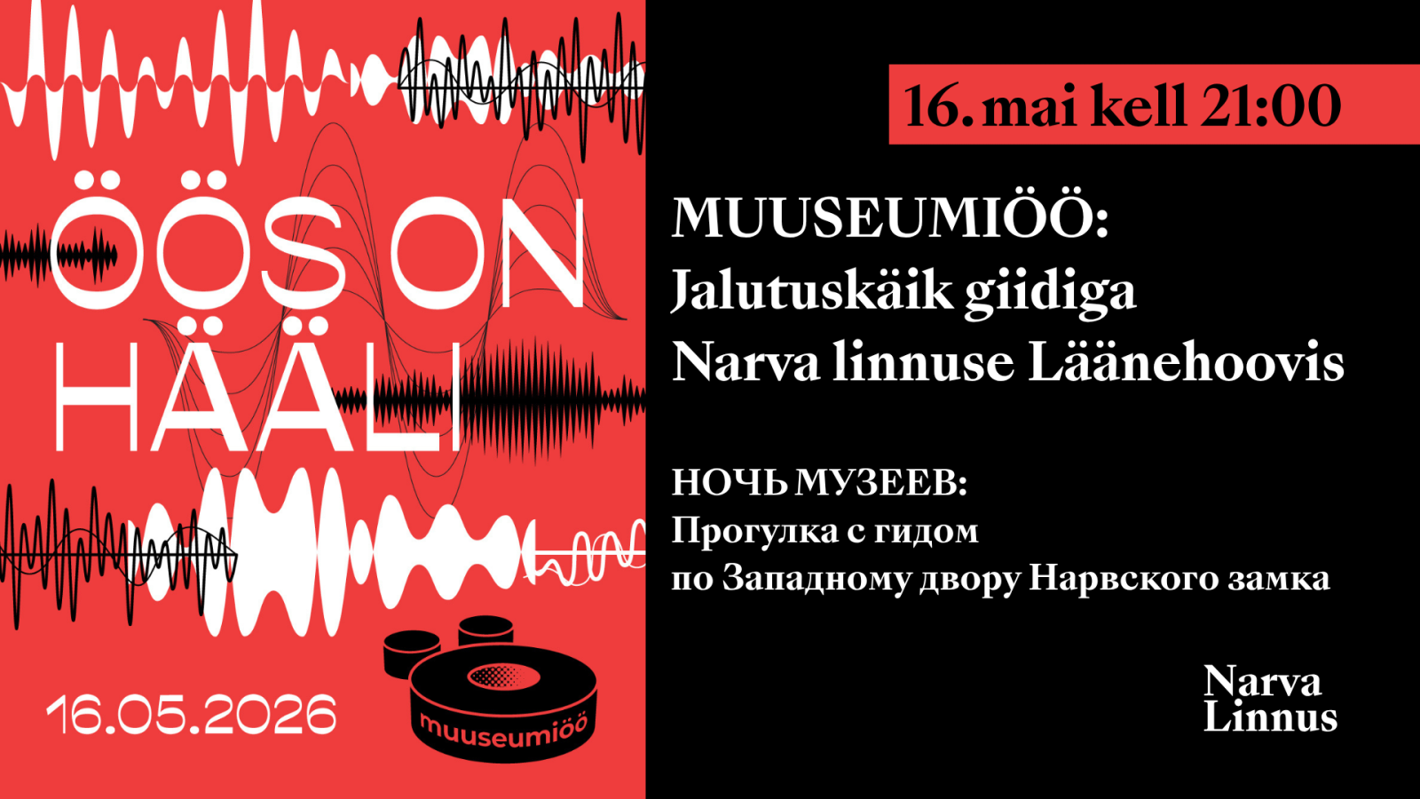 Muuseumiöö teema „Öös on hääli!“ kutsub kuulama – mitte ainult seda, mis on valjult öeldud, vaid ka seda, mis on ajas vaikinud. Narva linnuse Läänehoov on paik, kus erinevate ajastute hääled põimuvad: siin on kõlanud kaupmeeste sammud, sõdurite käsud, jõe kohin ja linnaelanike argipäev.
